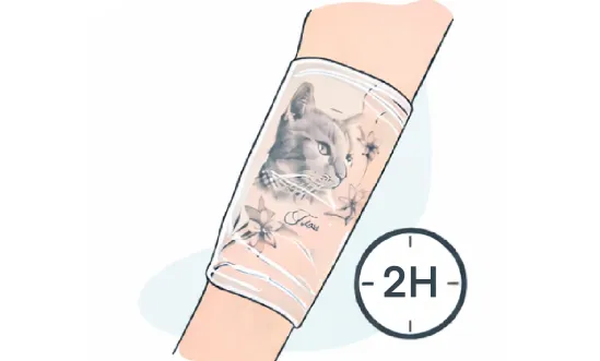 Il est conseillé de la garder 24 heures afin de protéger le tatouage. Le pansement doit être retiré avant ce délai si il se décolle prématurément.