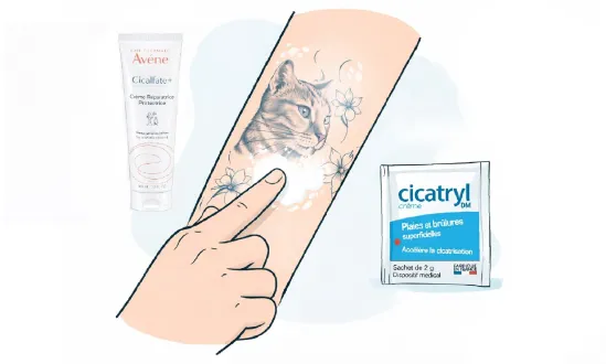 Après chaque douche ou après s’être laver les mains, appliquez une fine couche de crème cicatrisante sur votre tatouage préalablement nettoyé, sans surcharger la peau.
