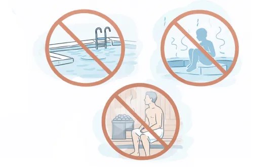 Évitez strictement les bains, la piscine, la mer, les rivières, le sauna ainsi que toute activité sportive.